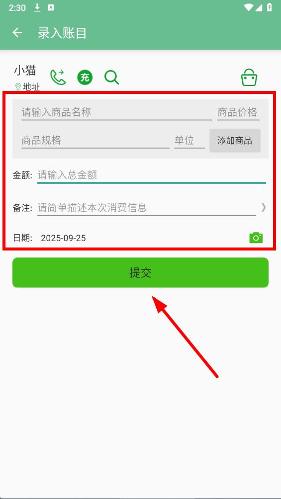 4、进入录入账目页面,填写信息,最后点击提交按钮,完成记账操作。
