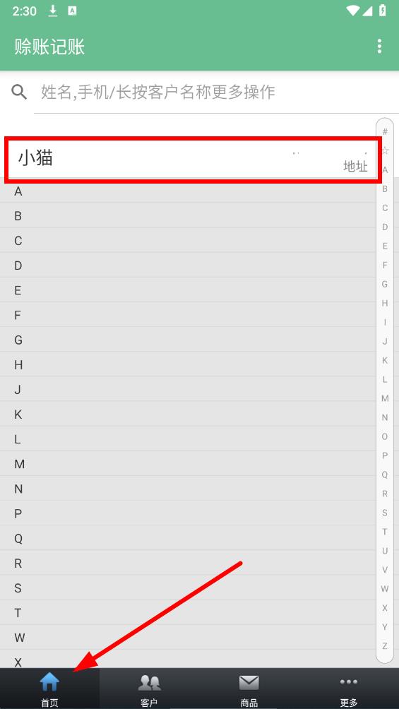 3、添加好客户后,点击底部导航栏的首页选项,回到首页,点击添加的客户。