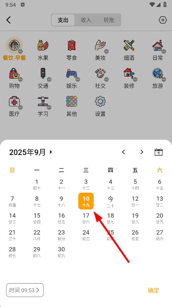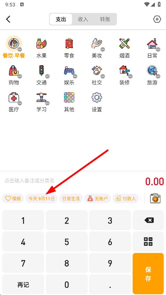 3、点击记账界面下方显示日期的位置,此时会弹出日期选择窗口。