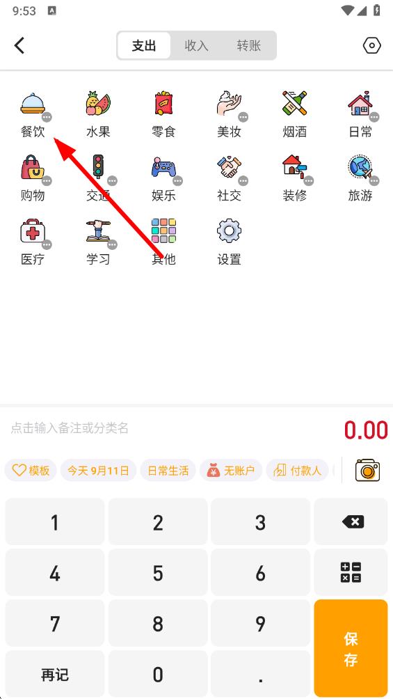 2、在记账界面,选择消费或收入类别,比如点击餐饮。