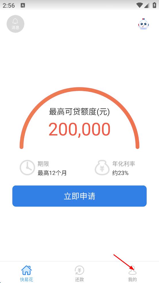 2、在APP主界面,能看到最高可贷额度等信息,点击页面右下角“我的”选项,进入登录相关页面。