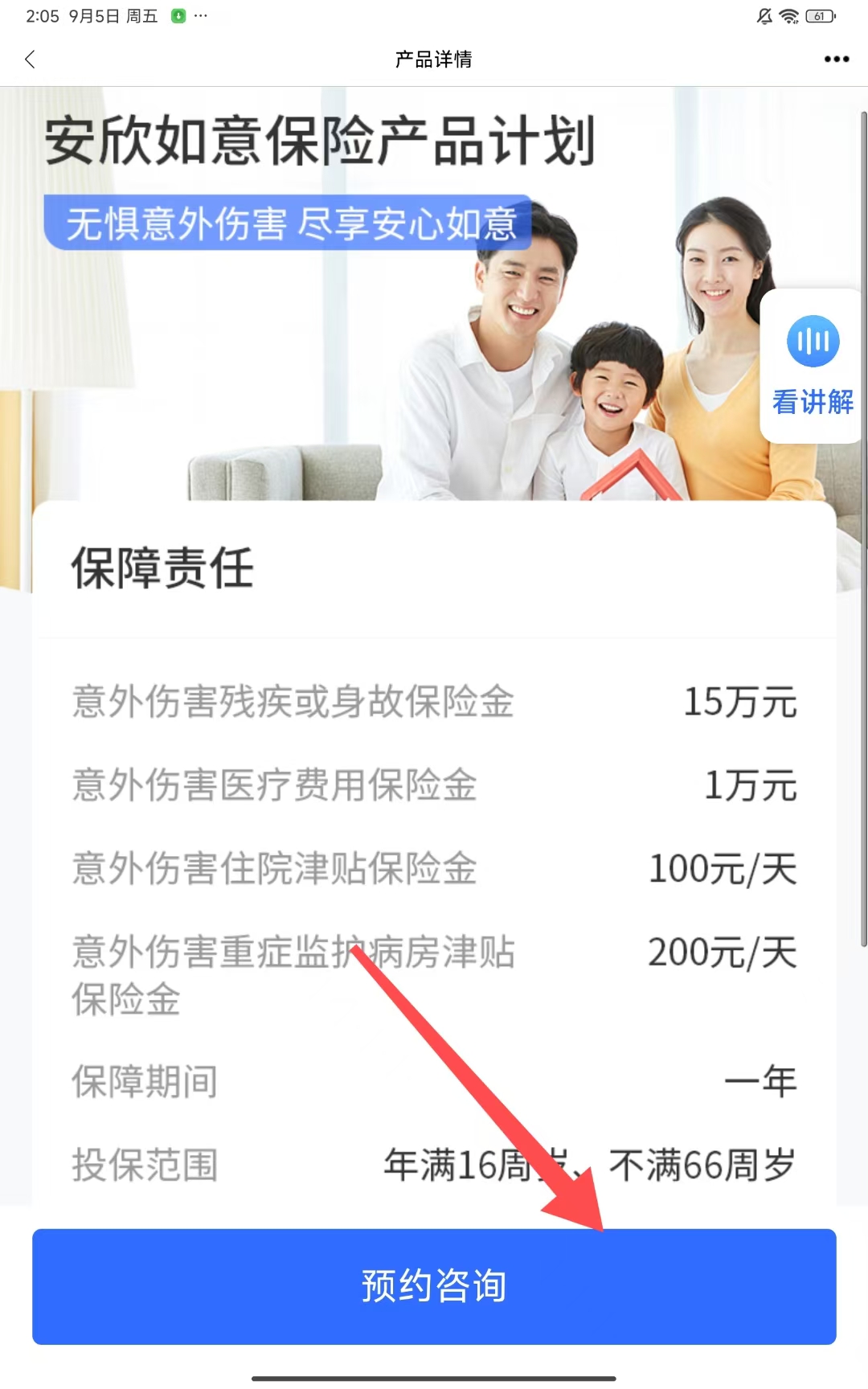 3、点击所选保险产品进入产品详情页,点击预约咨询按钮。