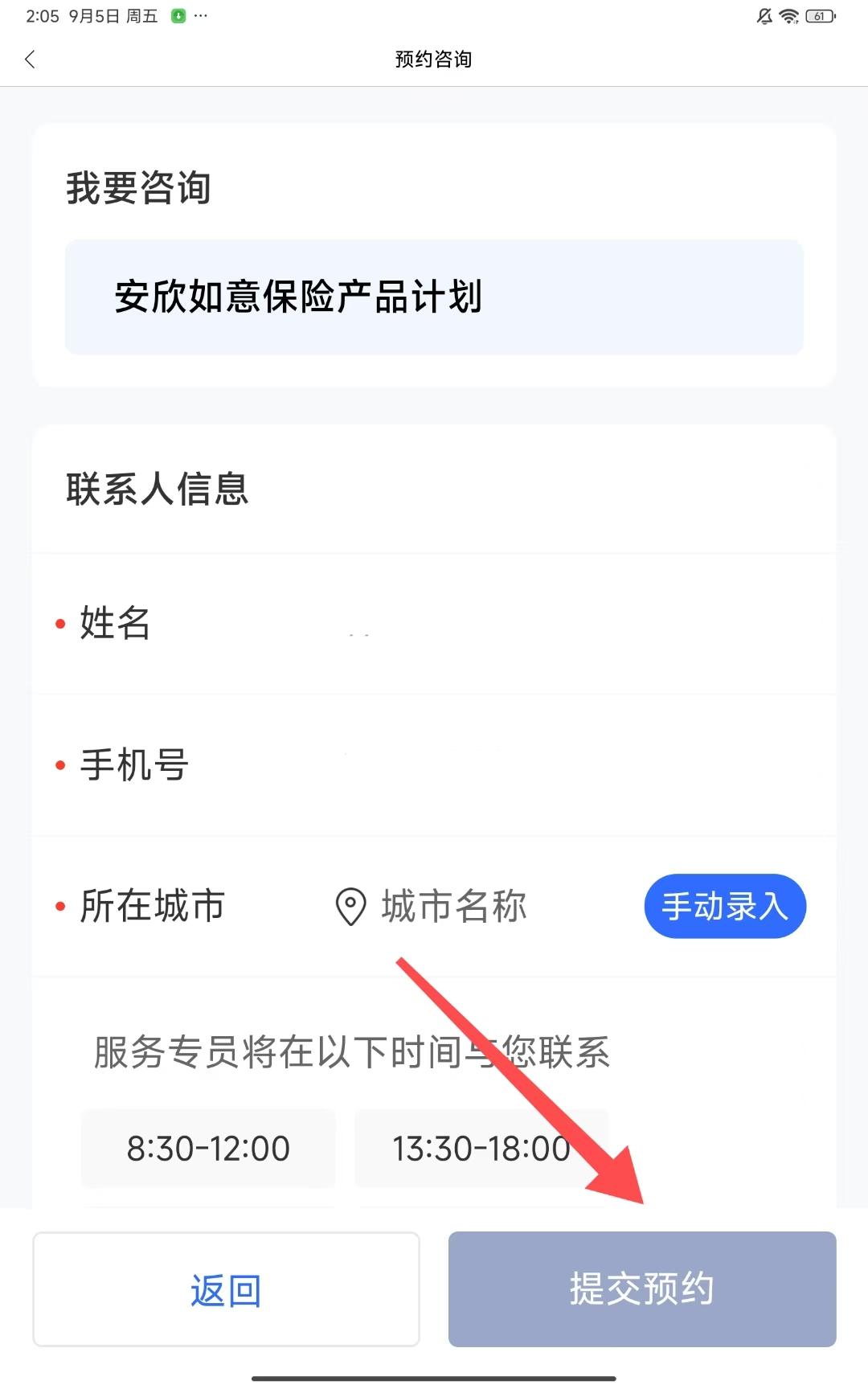 4、在预约咨询页面填写联系人信息后,点击提交预约等待咨询回复。