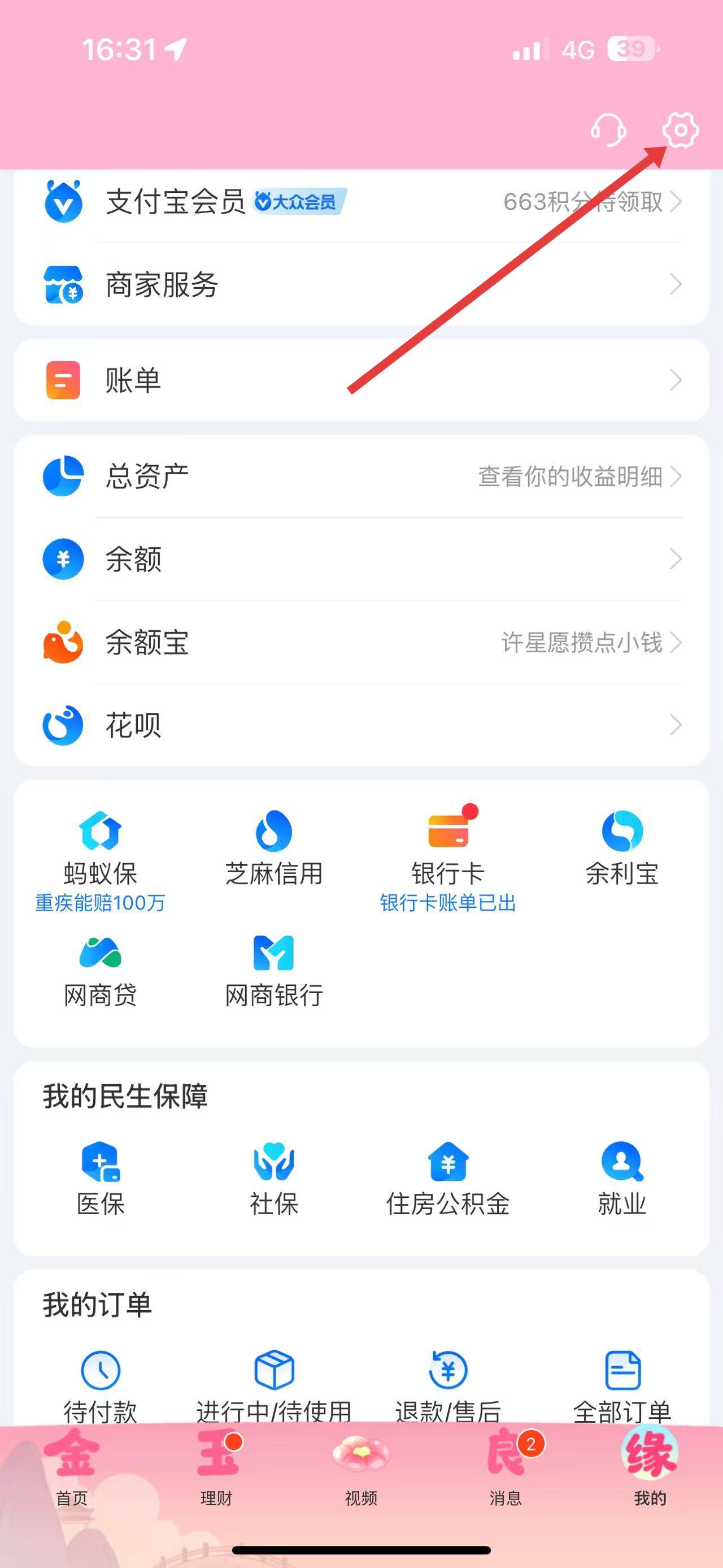 1、打开支付宝App,点击右下角我的,进入个人页面后,点击右上角设置图标。