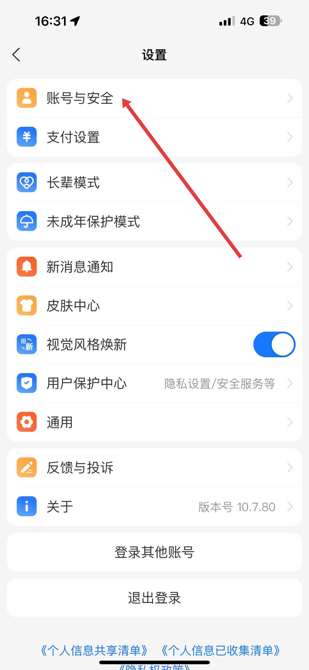 2、在设置页面中,点击账号与安全选项。