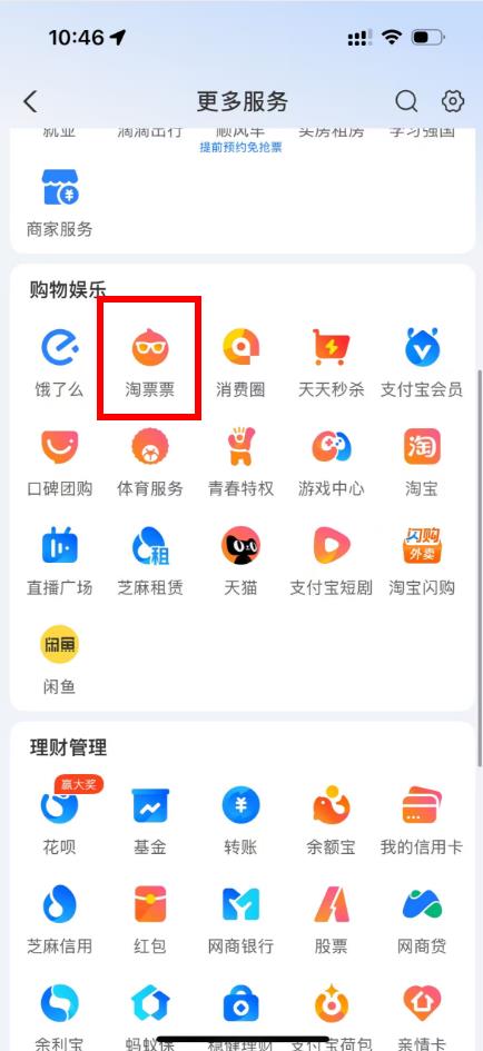 2、在更多服务界面的购物娱乐分类下,找到并点击淘票票。