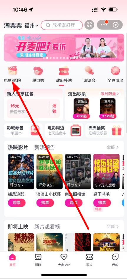 3、进入淘票票页面后,点击电影/剧院选项。
