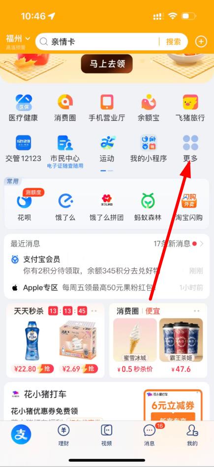 1、打开支付宝App,在首页点击更多选项,进入更多服务界面。