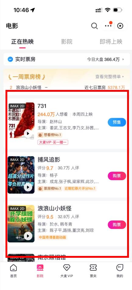 4、在电影界面中,查看正在热映的影片,选择想要观看的电影,点击其对应的购票按钮即可。