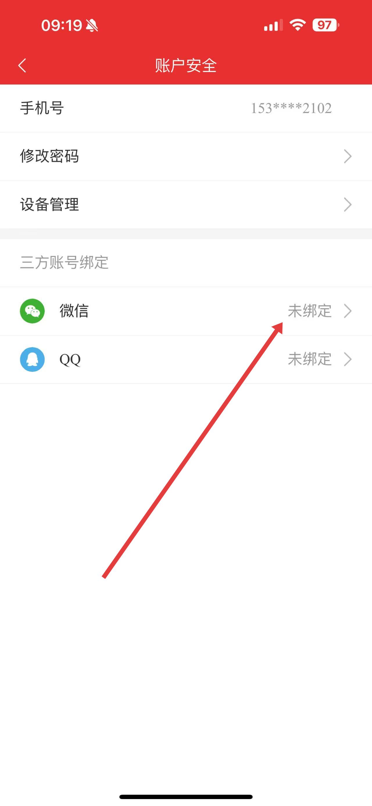 3、在账户安全页面,找到微信绑定入口,点击右侧未绑定按钮。