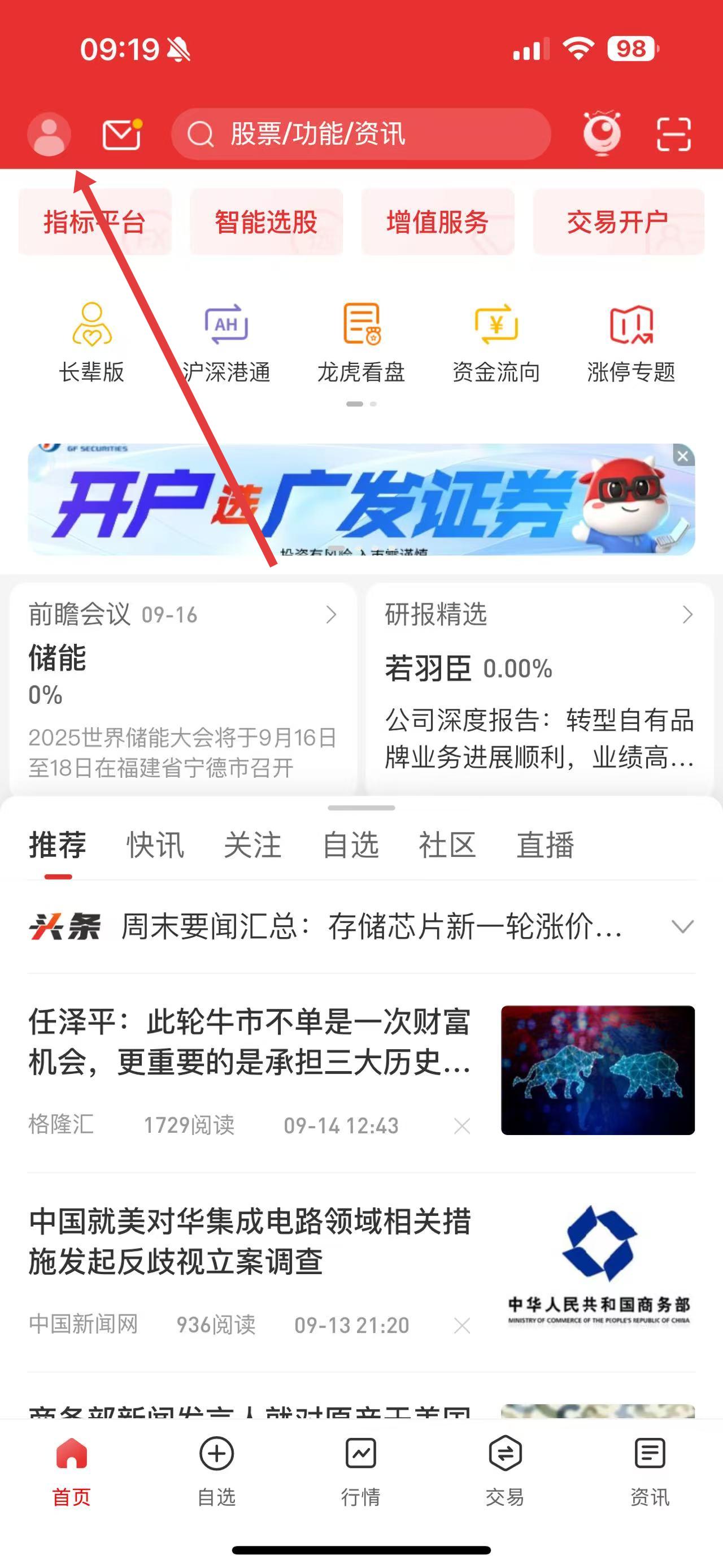 1、打开通达信APP,点击首页左上角的头像图标,进入个人中心页面。