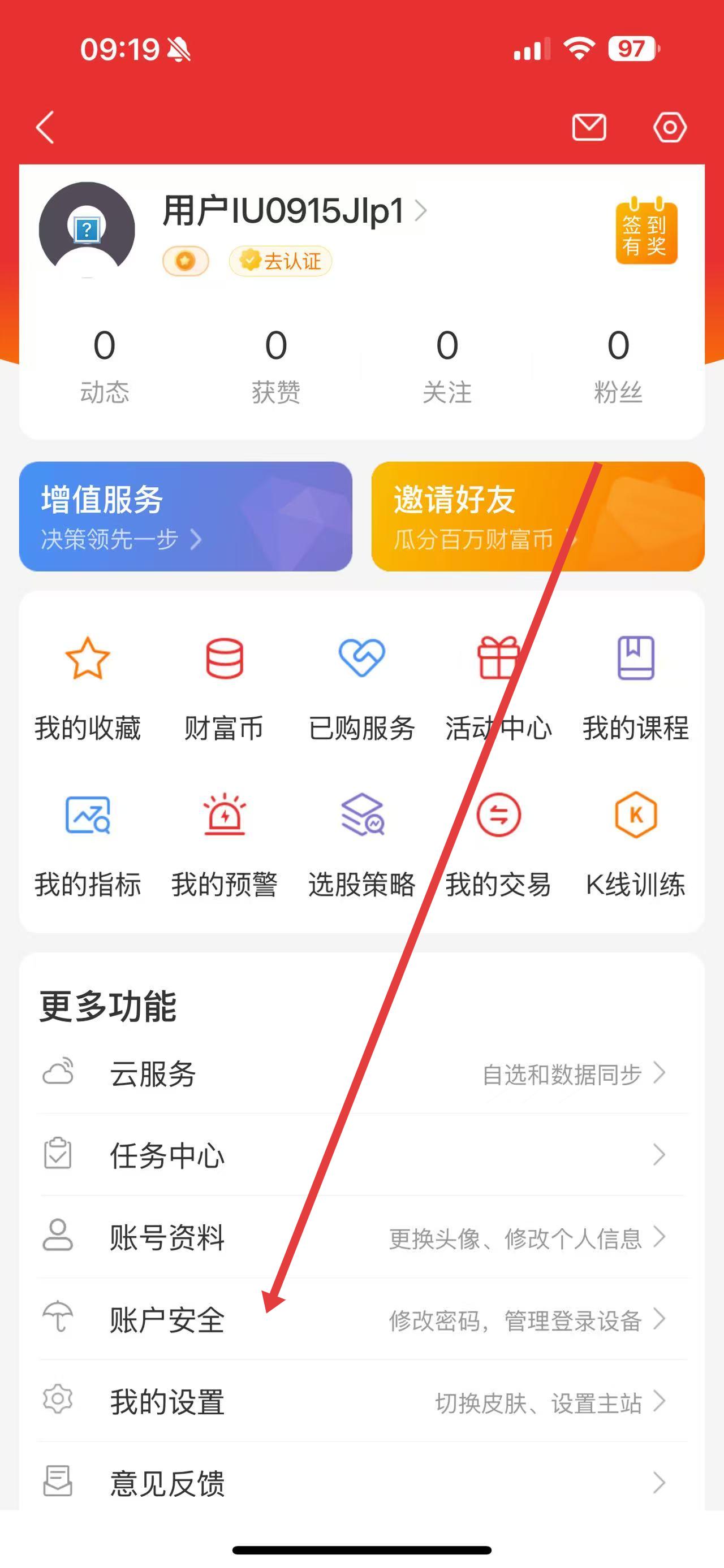2、在个人中心页面中,向下滑动找到账户安全选项,点击进入。
