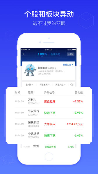 专职炒股没时间,总是错过买卖良机?有智能盯盘机器人。个股、板块异动实时监控,消息类型个性化定制。当行情触发条件时,盯盘机器人会自动发送提醒,帮您捕捉瞬息的交易良机,做您贴心的股市小管家。