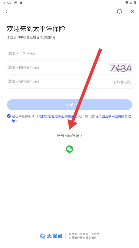 1、在太平洋保险账号登录页面中,可以点击账号密码登录按钮切换登录方式。