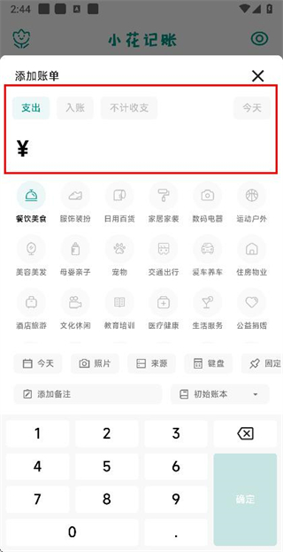 2、在添加账单页面选择账单类型后,输入金额信息。