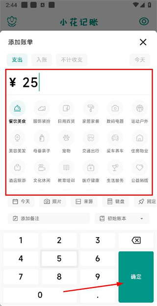 3、在添加账单页面确认信息后,点击确定按钮完成账单的添加。