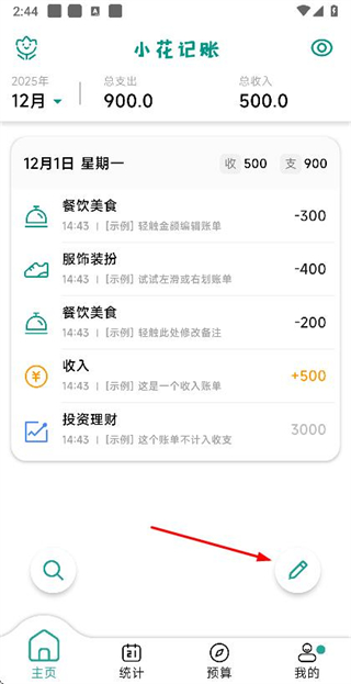 1、在小花记账首页点击右下角的编辑按钮,进入添加账单页面。