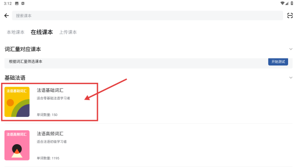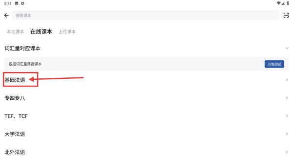 3、在在线课本列表中,点击基础法语分类,展开具体课本选项。
