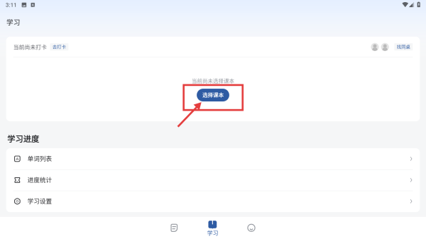 1、打开语言学习应用,在学习页面点击选择课本按钮,进入课本选择界面。