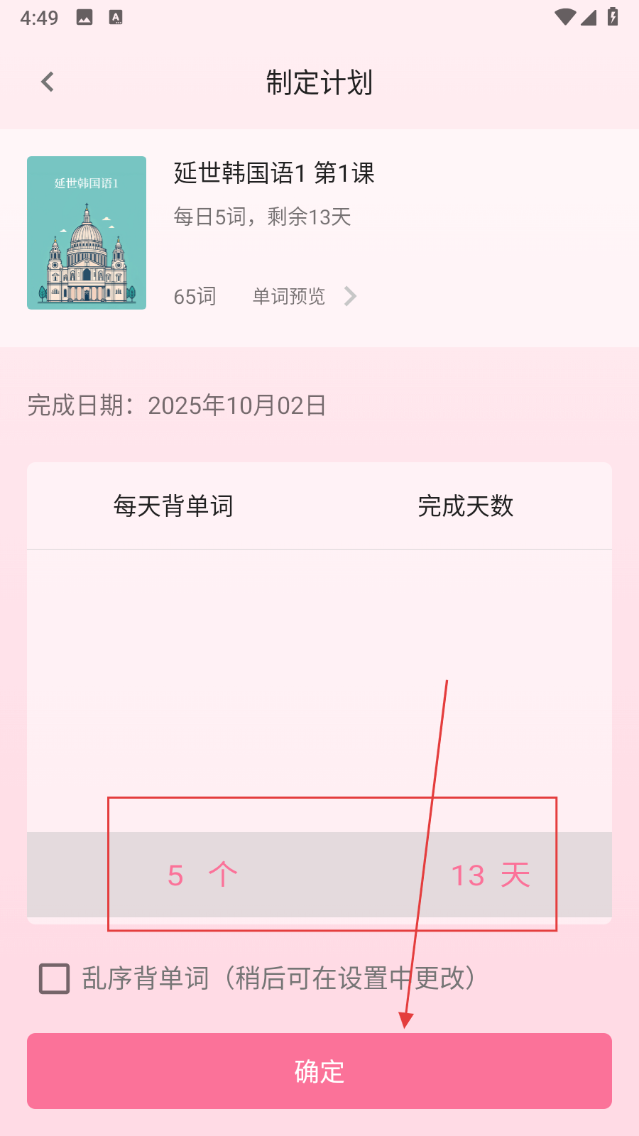 4、在制定计划页面,设置每天背单词的数量和完成天数,确认后点击确定。