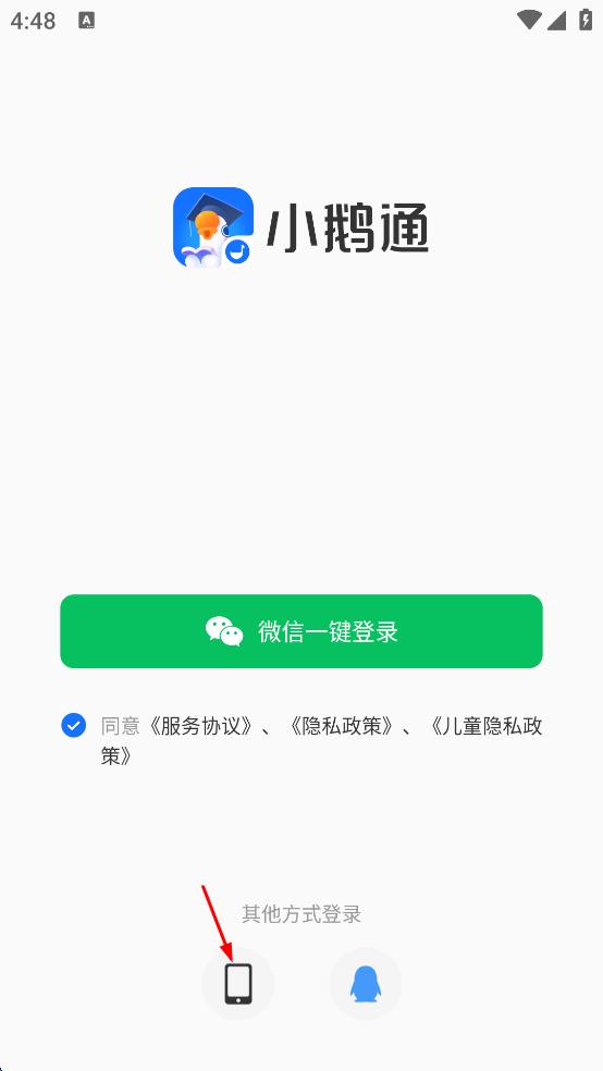 1、打开小鹅通软件,进入登录页面,点击页面下方的手机图标,进入登录方式选择页面。