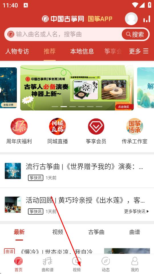 1、打开古筝网APP,进入首页,点击底部导航栏中的视频选项。