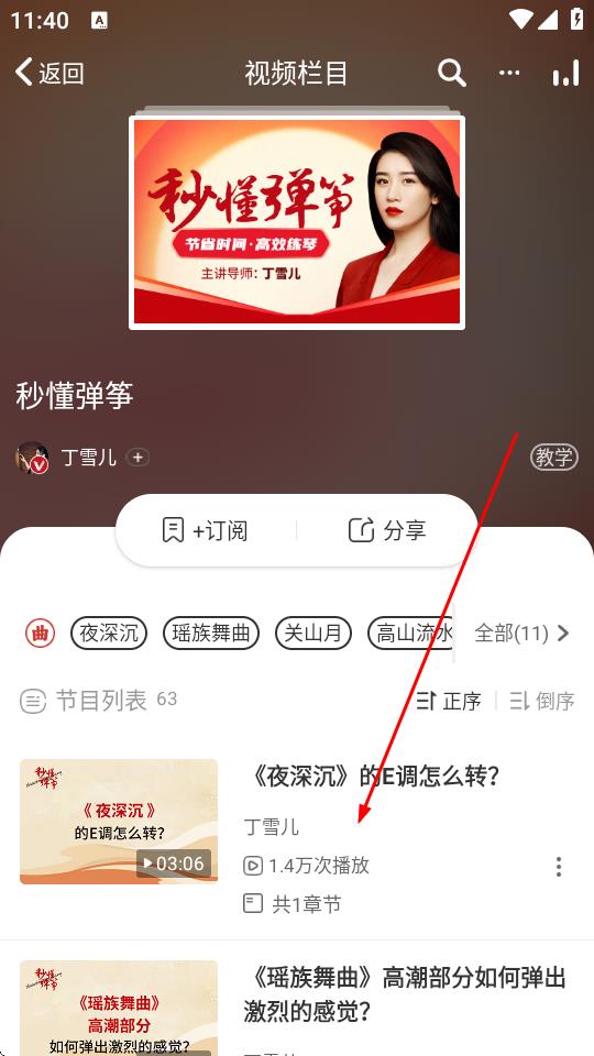4、进入视频栏目页面后,在节目列表中选择具体的教学视频内容,如夜深沉的E调怎么转。