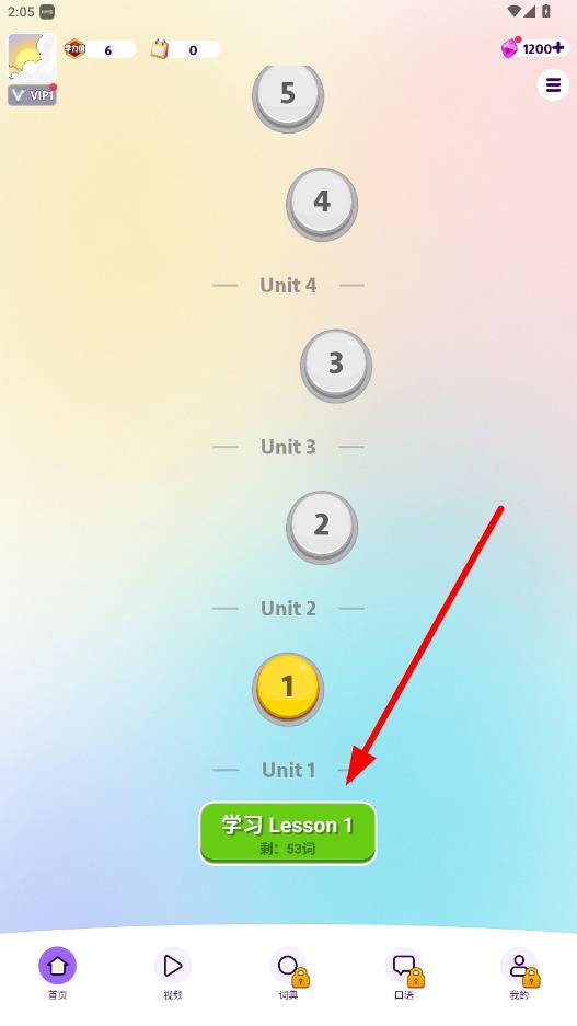 1、打开傻瓜英语app,在课程界面点击学习Lesson1按钮开始学习。