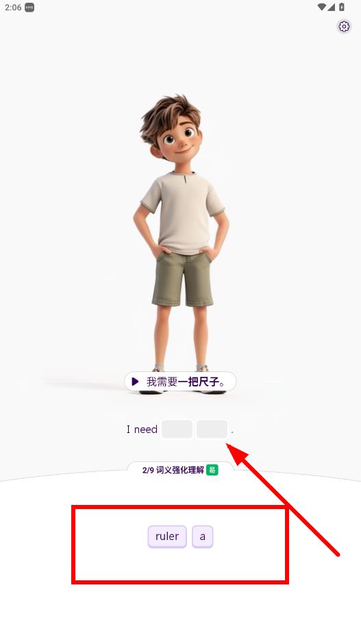 3、在语义强化理解环节,将下方词汇拖入空白处完成句子,如我需要一把尺子对应I need拖入a和ruler。