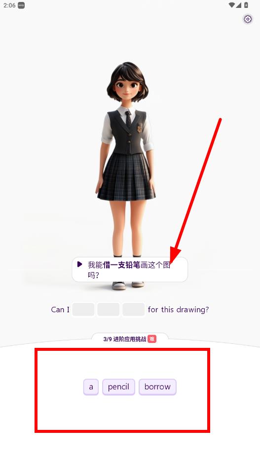 4、在进阶应用挑战部分,同样把下方的词汇拖入空白处,完成句子填空,比如针对我能借一支铅笔画这个图吗?,拖入borrow、a、pencil。