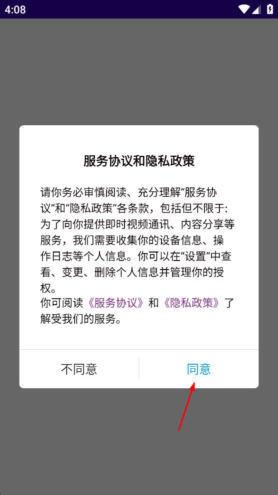 1、打开公丰同缘APP,在弹出的“服务协议和隐私政策”提示框中,点击“同意”按钮,进入登录页面。