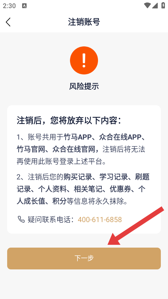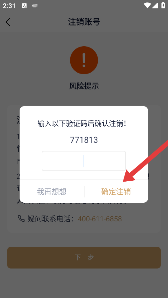 3、在注销账号风险提示页面点击下一步,进入验证码输入环节。