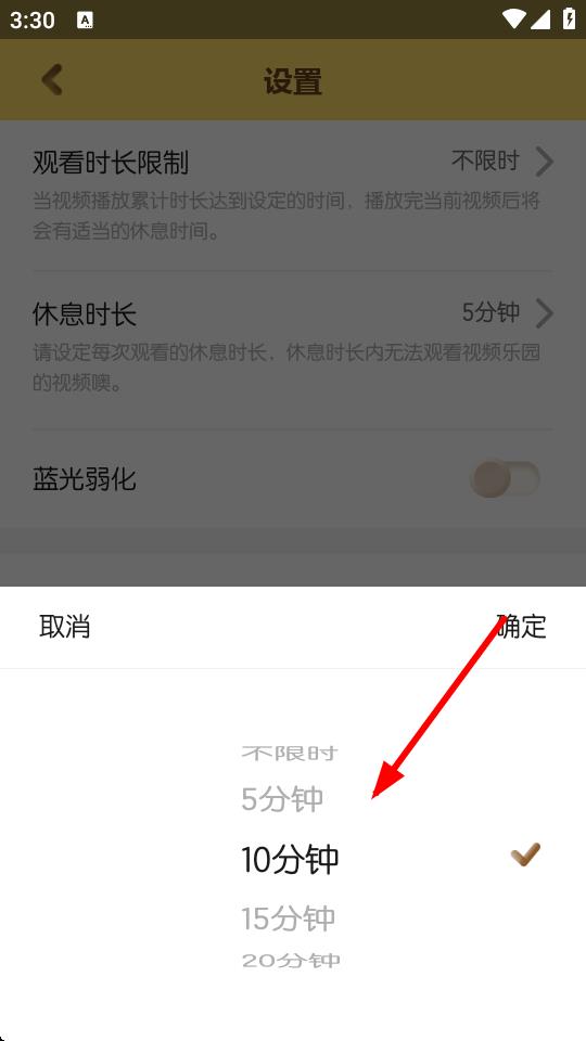4、在弹出的时长选择界面中,选择想要设置的观看时长,比如10分钟,然后点击确定按钮即可完成设置。