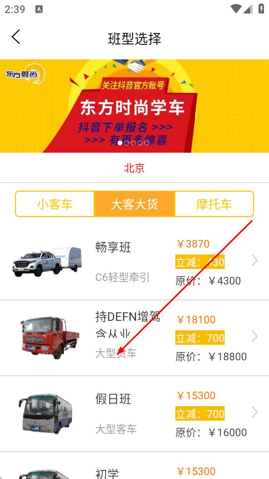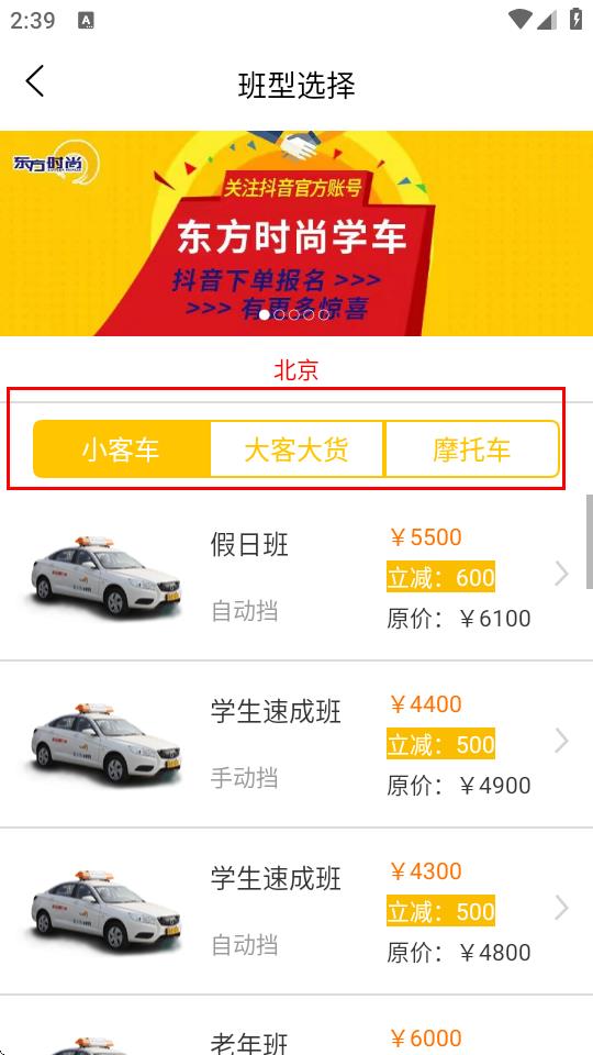 3、在所选车型类别下,浏览不同的班型,比如价格、优惠幅度等信息,选择适合自己的班型。