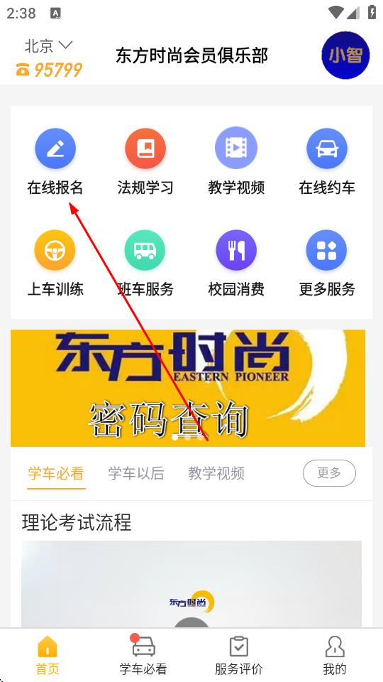 1、打开东方时尚会员俱乐部APP,在首页点击在线报名选项。