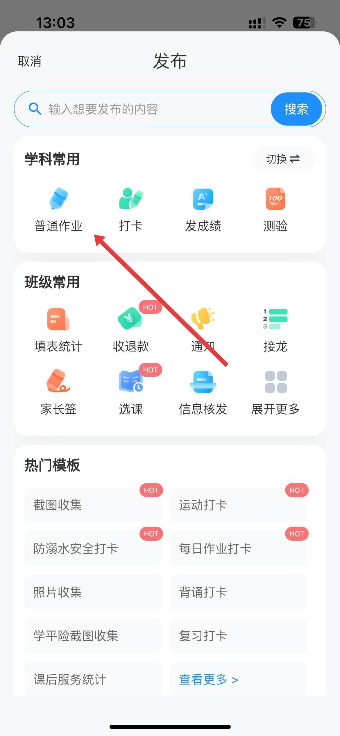 2、在发布界面中找到学科常用板块,点击其中的普通作业图标。