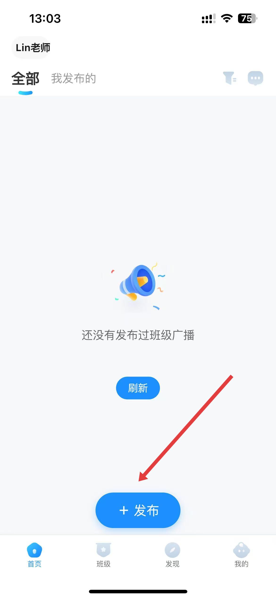 1、进入班级小管家小程序,在首页点击底部的“发布”。