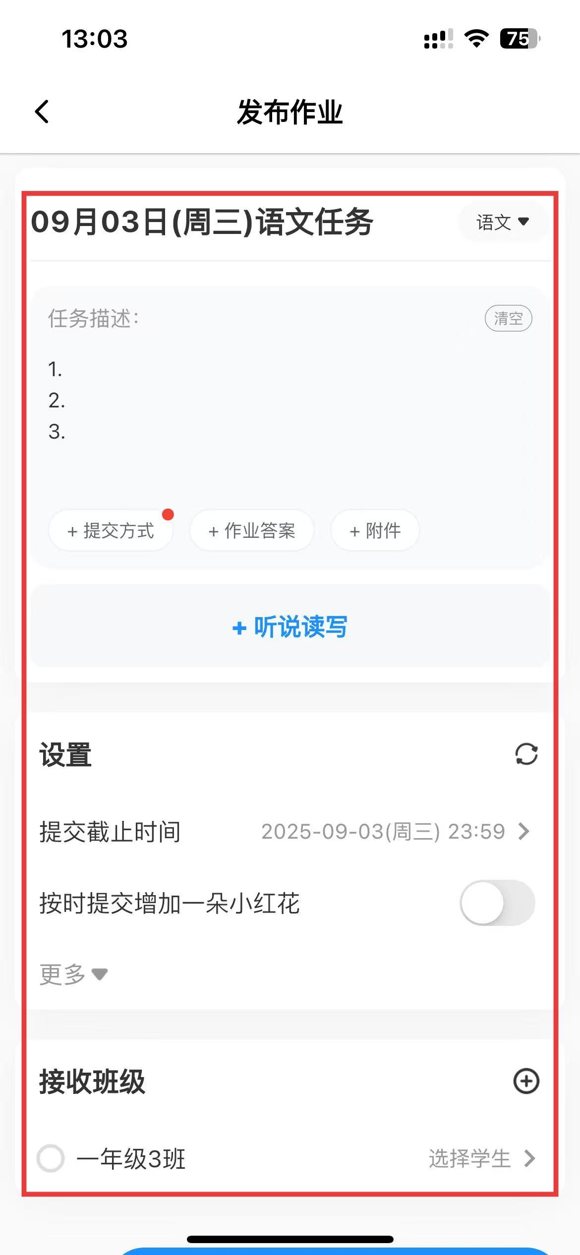 3、进入发布作业页面后,填写作业内容,设定时间,选择接收班级后点击发布即可。