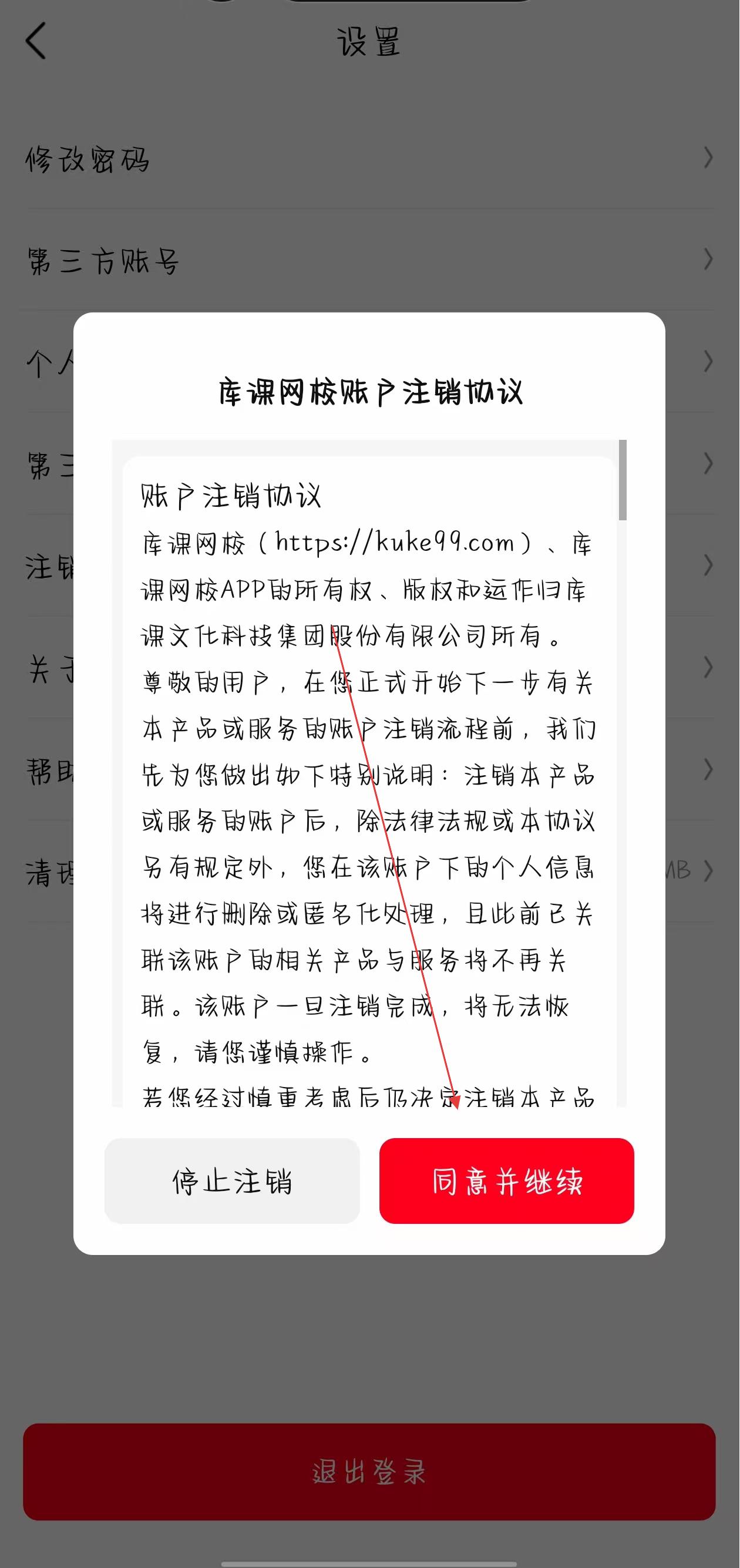 3、仔细阅读注销协议后,点击弹窗里的同意并继续按钮。