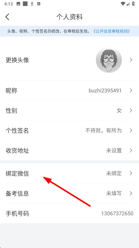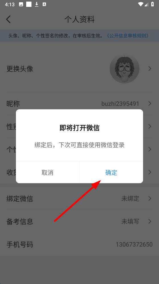3、在个人资料页面里找到绑定微信选项并点击,在弹出的提示框中点击确定后按照后续提示完成微信绑定操作。