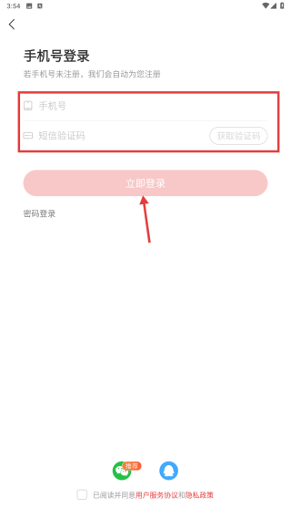 4、在手机号登录页面,输入手机号和短信验证码,点击立即登录按钮,完成账号登录。