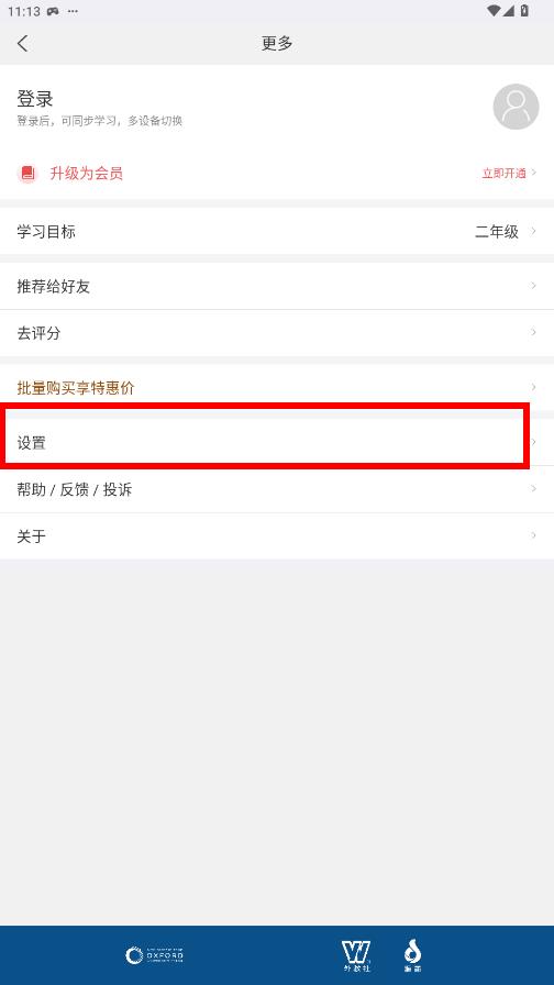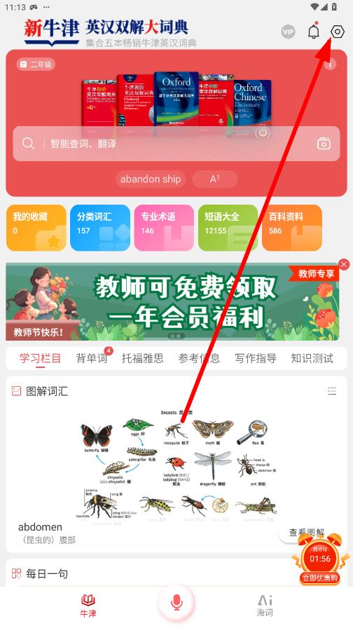 1、在新牛津英汉双解大词典APP界面,点击右上角的设置图标,进入更多页面。