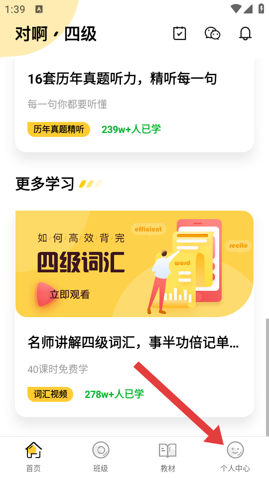 1、在对啊四级的首页,需要点击个人中心,进入个人功能页面。