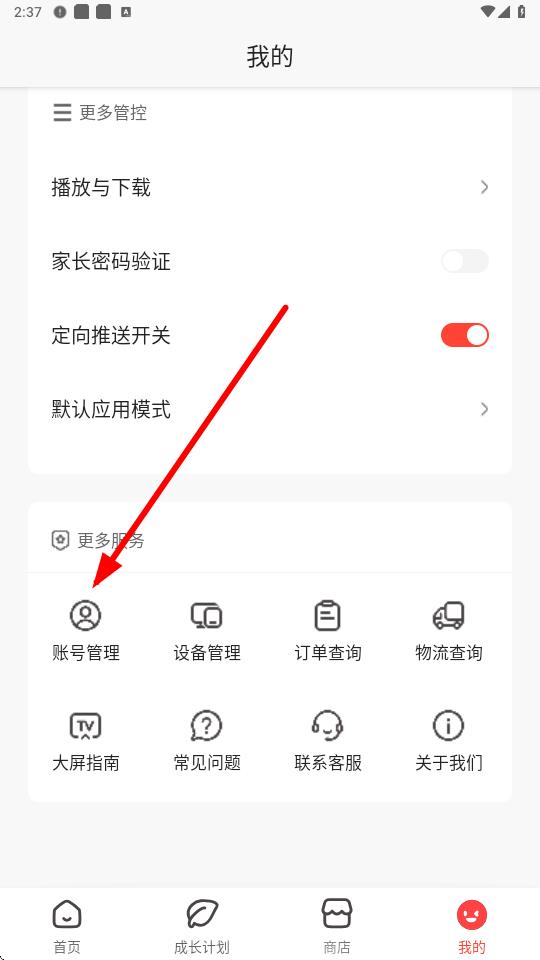 2、在我的页面,向下滑动,找到账号管理选项并点击。