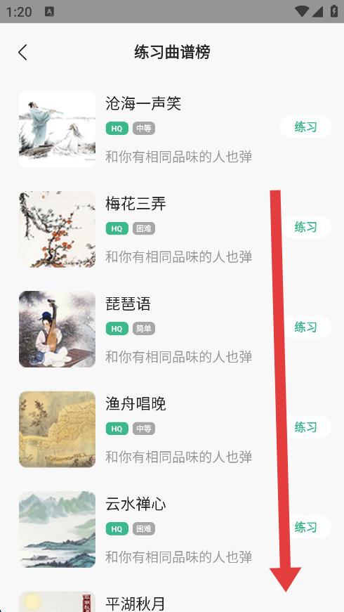 2、进入练习曲谱榜页面后,浏览曲谱列表,找到想要练习的曲目。