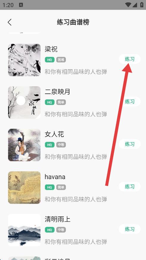 3、找到目标曲目后,点击其右侧的练习按钮,进入练习页面。