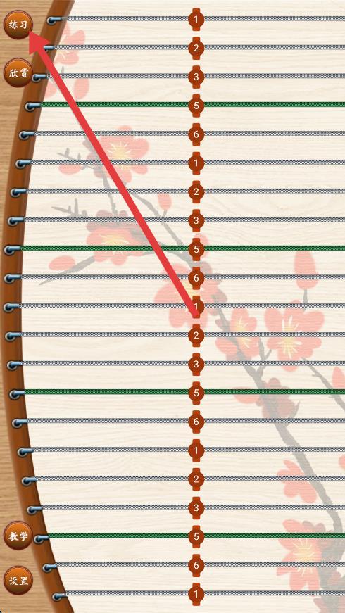 1、打开古筝教学App,点击界面左上角的练习按钮。