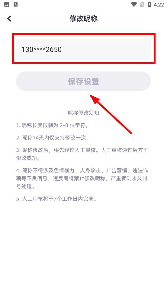 3、在输入框中输入你想要修改的昵称,确认无误后点击保存设置后昵称即可修改成功。