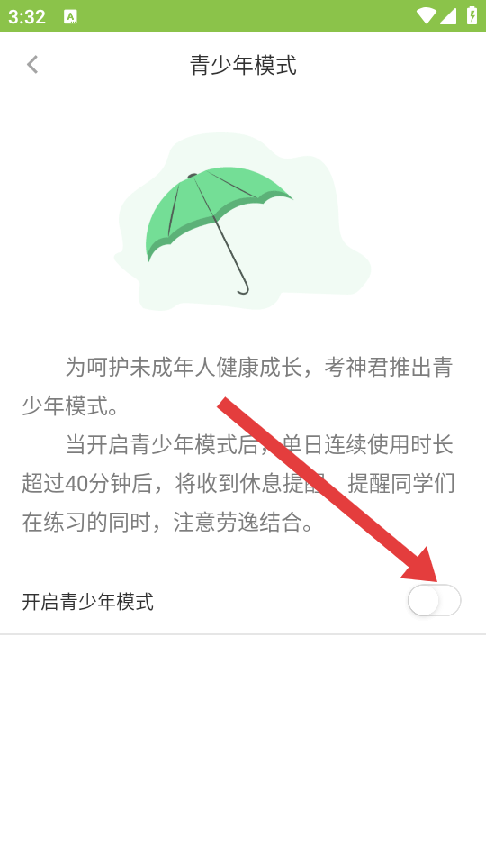 4、在青少年模式页面开启开启青少年模式开关,完成模式设置。
