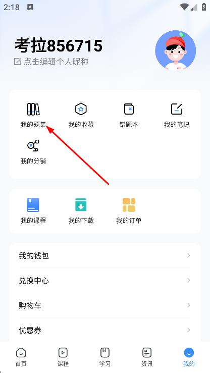 2、在个人中心页面,点击我的题集,进入我的题集页面。